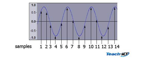 The idea of 'sampling' is to take measurements of the amplitude of the sound wave at various points in time. Like this: